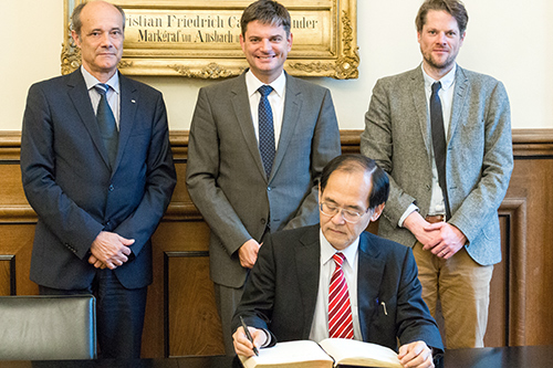Der japanische Generalkonsul, Hidenao Yanagi, war zu Gast an der FAU. Yanagi hat im vergangenen Jahr seinen Dienst in München mit Zuständigkeit für Bayern und Baden-Württemberg angetreten. FAU-Präsident Prof. Dr. Joachim Hornegger und Vizepräsident Prof. Dr. Günter Leugering begrüßten den Generalkonsul im Erlanger Schloss, wo sich Yanagi ins Goldene Buch der FAU eintrug.