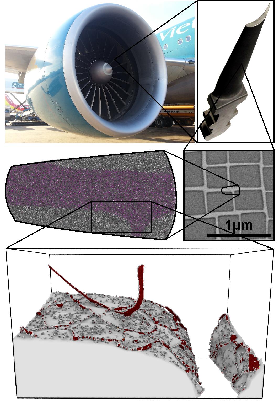 Superlegierungen – metallische Werkstoffe, die aus Nickel und Aluminium sowie verschiedenen weiteren Elementen wie Rhenium zusammengesetzt sind – sind für die Herstellung von Turbinenschaufeln, etwa in einem Flugzeugtriebwerk, unverzichtbar. Sie sorgen dafür, dass die Turbinen auch bei höchsten Temperaturen bis nahe an ihrem Schmelzpunkt stabil bleiben – bei den immensen Belastungen durch Fliehkräfte ein Muss. Werkstoffwissenschaftler arbeiten daher permanent daran, diese Superlegierungen weiter zu verbessern. Forschern der FAU um Prof. Dr. Erik Bitzek ist es nun erstmals gelungen, die atomare Struktur einer Nickelbasis-Superlegierung so exakt im Computer nachzubauen, dass Simulationen tatsächlich die Verformungsprozesse in der realen Materialstruktur wiedergeben und erklären können. Bislang konnten Forscher immer nur mit idealisierten Strukturen im Computer arbeiten.