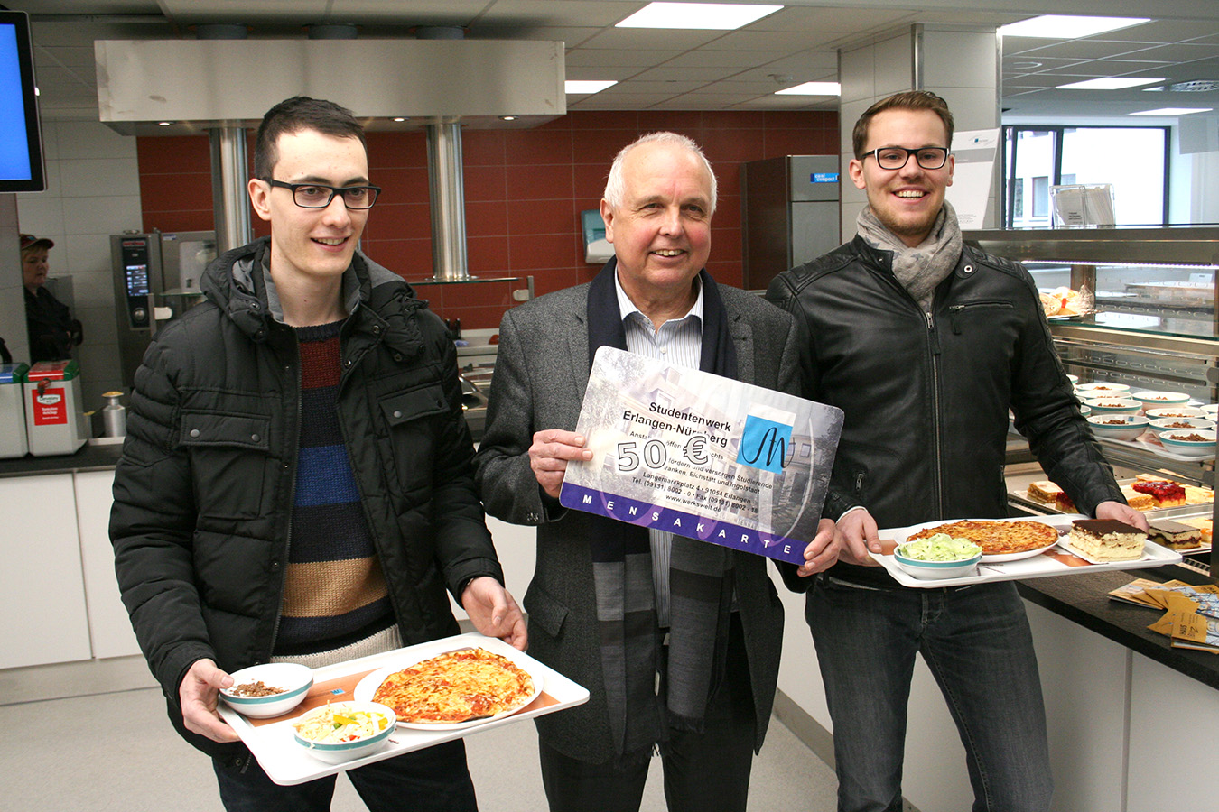 Die neueröffnete Mensa am Erlanger Langemarckplatz begrüßte am Montag, 22. Februar, ihre ersten Gäste: Simon Bauch und Aaron Döhler essen regelmäßig im Studentenhaus. Begeistert vom neuen Sortiment, empfehlen die beiden Masterstudenten Pizza.