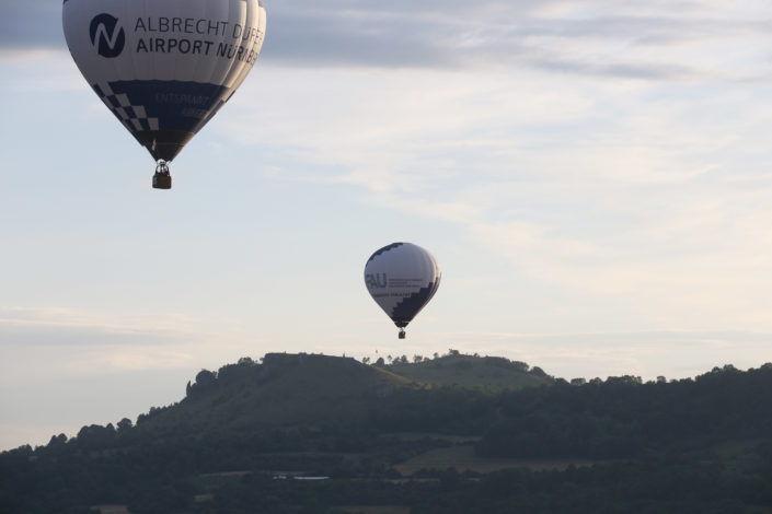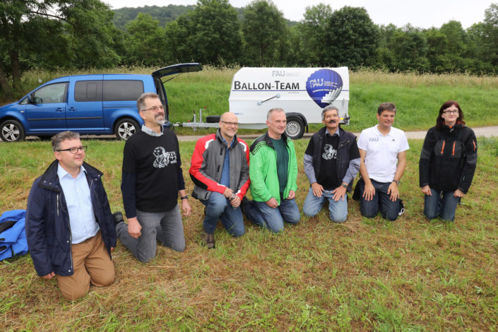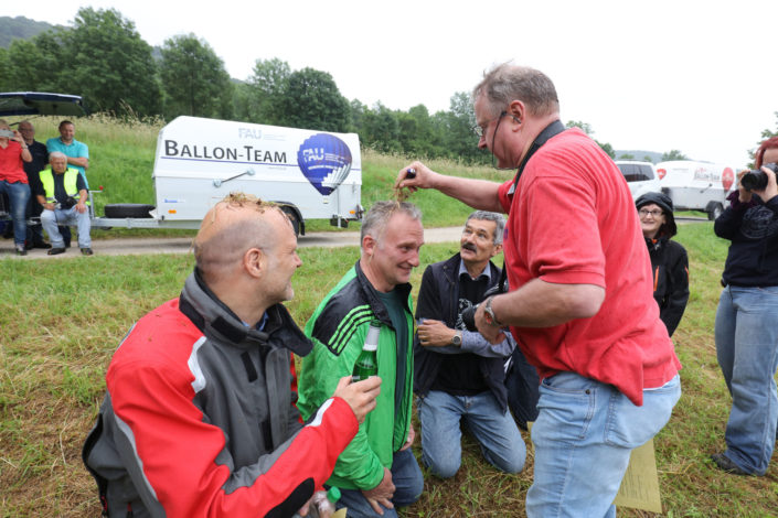 In Begleitung weiterer Ballone ging es in rund einstündiger Fahrt über das Walberla bis in die Nähe von Ebermannstadt. Unter den Passagieren waren zahlreiche FAU-Angehörige sowie Gäste der Ballonpiloten. Nach einer sanften Landung – rechtzeitig vor der heraufziehenden Regenfront – wurden der Tradition der Ballonfahrer entsprechend die Neulinge getauft. „Dabei bekommt jeder Neu-Ballöner einen eigenen Namen, der dem Umstand Rechnung trägt, dass zu den Anfangszeiten der Ballonfahrt nur Adlige in den Genuss des neuentdeckten Beförderungsmittels kamen, und der auf humorvolle Weise meist die Umstände der ersten Fahrt beschreibt“, erzählte Dr. Bernhard Mohr, CBI-Geschäftsführer und leidenschaftlicher Ballonfahrer. Das anschließende gemeinsame Frühstück gab dann allen Gelegenheit, die neuen ellenlangen Namen bei gegenseitigen Vorstellungen einzuüben. „Diese zu vergessen, ist ebenso ein Lapsus wie von einem Ballonflug zu sprechen“, erläuterte er. Der Terminus Ballonfahrt gehe auf die historische Entwicklung der Luftfahrt im „Luftmeer“ zurück.