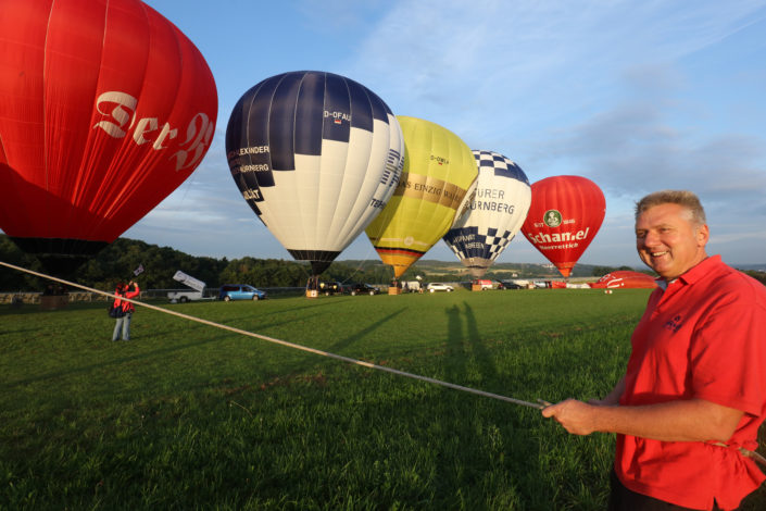 Zum 50. Geburtstag hat die TechFak der FAU einen Ballon gesponsert bekommen. Tauffahrt war am 2. Juli 2016 in Begleitung weiterer Ballons in der Fränkischen Schweiz. Hier tauft FAU-Präsident Prof. Dr. Joachim Hornegger den Ballon. (Bild: FAU/Kurt Fuchs)