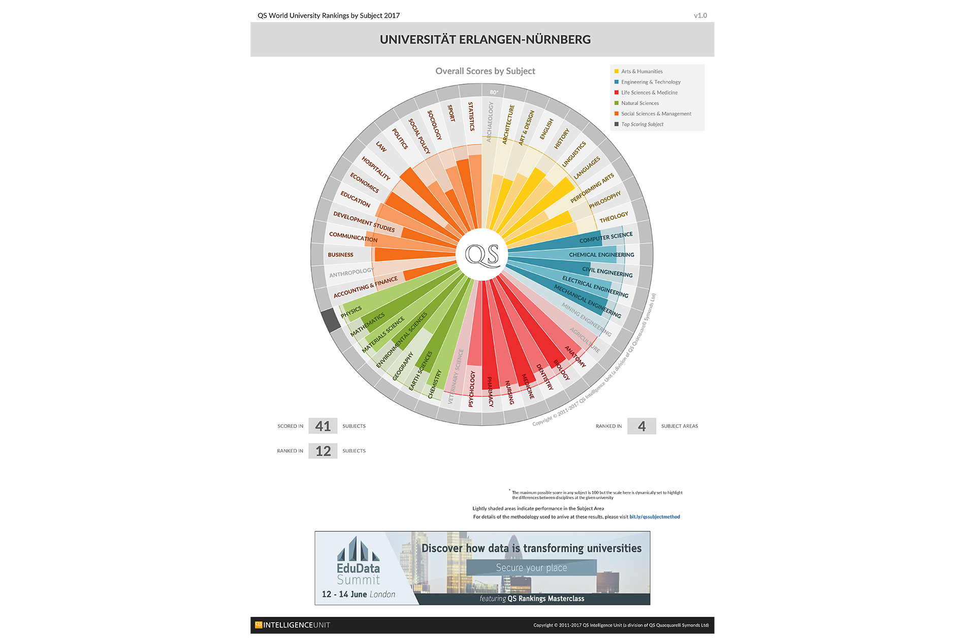 In den Bereichen Medizin, Geistes-, Ingenieur-, Natur- sowie Sozial- und Wirtschaftswissenschaften platziert sich die FAU mit zwölf Einzelfächern unter den besten 350 Universitäten weltweit. Die FAU wurde in vier von fünf Fächergruppen gerankt und gehört in den Bereichen Ingenieurwissenschaften und Medizin nun zu den Top 200, in den Naturwissenschaften sogar zu den Top 150. Die Geisteswissenschaften klettern ebenfalls sechs Plätze nach oben. Den größten Sprung machen die Ingenieurwissenschaften, die sich um 48 Plätze verbessern.