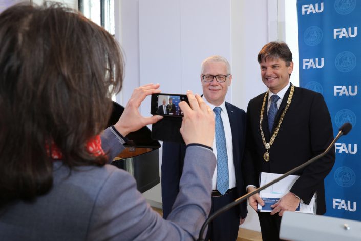 Universitätspräsident Prof. Dr. Joachim Hornegger stellte in seiner Begrüßung das neue Mitglied der Universitätsspitze als einen Mann vor, der eine Situation analysiert, sich ein Bild macht und dann tatkräftig zupackt. „Nach nur acht Wochen Zusammenarbeit kommt es mir so vor, als wäre er schon immer dagewesen.“
