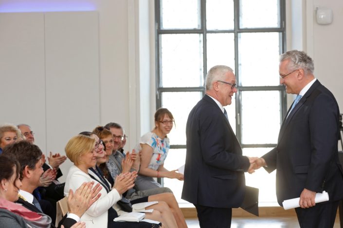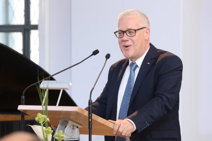Der Bayerische Staatsminister des Inneren, für Bau und Verkehr, Joachim Herrmann, knüpfte an die vom Kanzler skizzierte „Atmosphäre des Aufbruchs“ an und freute sich in seinem Grußwort auf die interessanten Diskussionen zu Standortfragen, die vor Universität und Politik lägen. Er vertraue auf kluge und zukunftsweisende Lösungen, die die Vorteile der FAU weiter stärken werden.