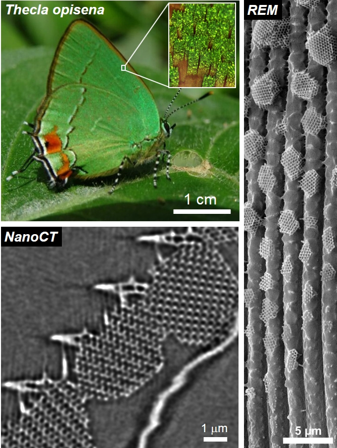 In einer Kooperation mit zwei führenden Experten der Schmetterlingsforschung, Dr. Bodo Wilts von der Universität Fribourg in der Schweiz und Dr. Gerd Schröder-Turk von der Murdoch-Universität Perth in Australien, sowie der Firma Zeiss-Xradia nutzten die Erlanger Materialforscher hochauflösende Mikroskopieverfahren, um das Rätsel zu lösen, wie sich die photonischen Kristalle bilden. Bei der Untersuchung des Thecla opisena stellten sie eine Besonderheit fest, die den Durchbruch ermöglichte. Anders als bei anderen Schmetterlingen sind die photonischen Kristalle auf den Flügelschuppen des Thecla opisena nämlich voneinander getrennt. Dabei nimmt die Größe der Kristalle entlang der Schuppe vom Ansatz bis zur Spitze kontinuierlich zu. Die Forscher gehen davon aus, dass die ursprüngliche Bildung der Kristalle während der Verpuppung in verschiedenen Stadien „eingefroren“ wurde. Die Kristalle geben also Auskunft über die verschiedenen Entwicklungsstadien – ähnlich wie die Jahresringe eines Baumes. Betrachtet man die winzigen Flügelschuppen somit unter dem Mikroskop, liegt die Bildungshistorie der photonischen Kristalle vor einem wie ein offenes Buch.