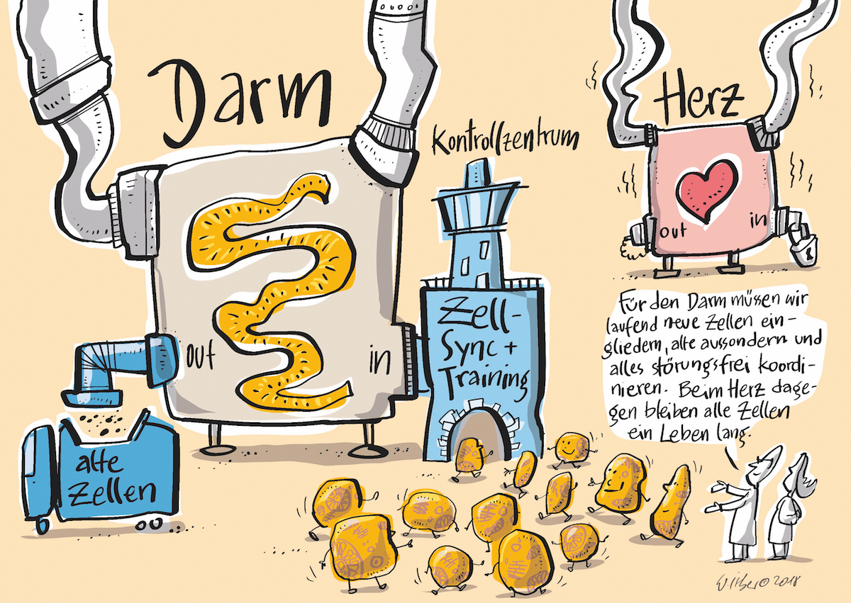 Was für die Zellen des Darmepithels zum Alltag zählt, ist für Herzmuskelzellen von Säugetieren eine Rarität. Embryonen können solche Zellen neu bilden, doch schon kurz nach der Geburt ist es damit vorbei; allenfalls ein Prozent pro Jahr wächst nach. Wozu die Sparsamkeit gut ist? Das gehört nach Prof. Felix Engel in den Bereich der Spekulation. Damit der Herzschlag im Rhythmus bleibt, müssten neu eingeschleuste Muskelzellen sofort in den Takt einstimmen. Außerdem entfällt eine mögliche Fehlerquelle, weshalb Krebserkrankungen des Herzmuskels kaum bekannt sind. Als Erklärung reicht das aber nicht aus.