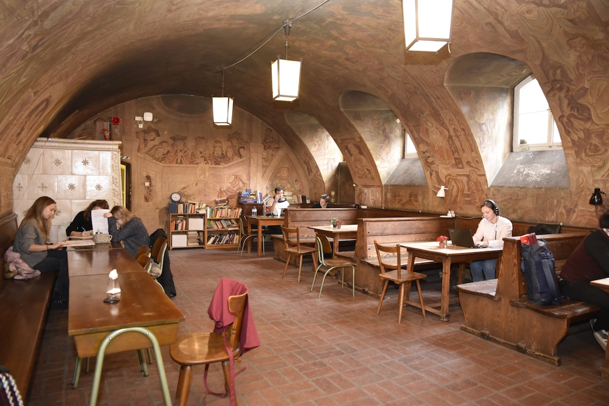 Einige Treppenstufen führen in den Keller des Fachbereichs Wirtschafts- und Sozialwissenschaften (WiSo) der FAU in der Findelgasse. Bereits auf dem Weg kündigen Schilder das Studierendencafé „Trichter“ an. Auf der gewölbten Decke – der Raum hat ein Tonnengewölbe mit einschneidenden Runderkern – erstreckt sich eine Bemalung über die ganze Fläche. Verschiedene Szenen aus der Nürnberger Stadtgeschichte sind zu sehen. Die rustikalen Holzgarnituren und der urige Kachelofen sind im Original erhalten.