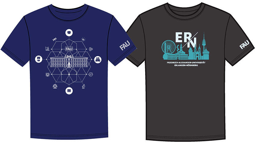 Es war wieder ein Kopf-an-Kopf-Rennen – Studierende und Beschäftigte wählten mit 23 Prozent das Design Nr. 6 zum offiziellen FAU-Shirt 2019. Auf dem blauen Shirt ist das Erlanger Schloss abgebildet, um das Symbole für die fünf Fakultäten kreisen. Mit 22 Prozent landete das Design Nr. 5 auf dem zweiten Platz. Das dunkelgraue Shirt mit der Erlanger und Nürnberger Skyline ging ebenfalls in Produktion. Beide Shirts sind ab sofort im FAU-Onlineshop für 12,50 Euro zzgl. Versand erhältlich.