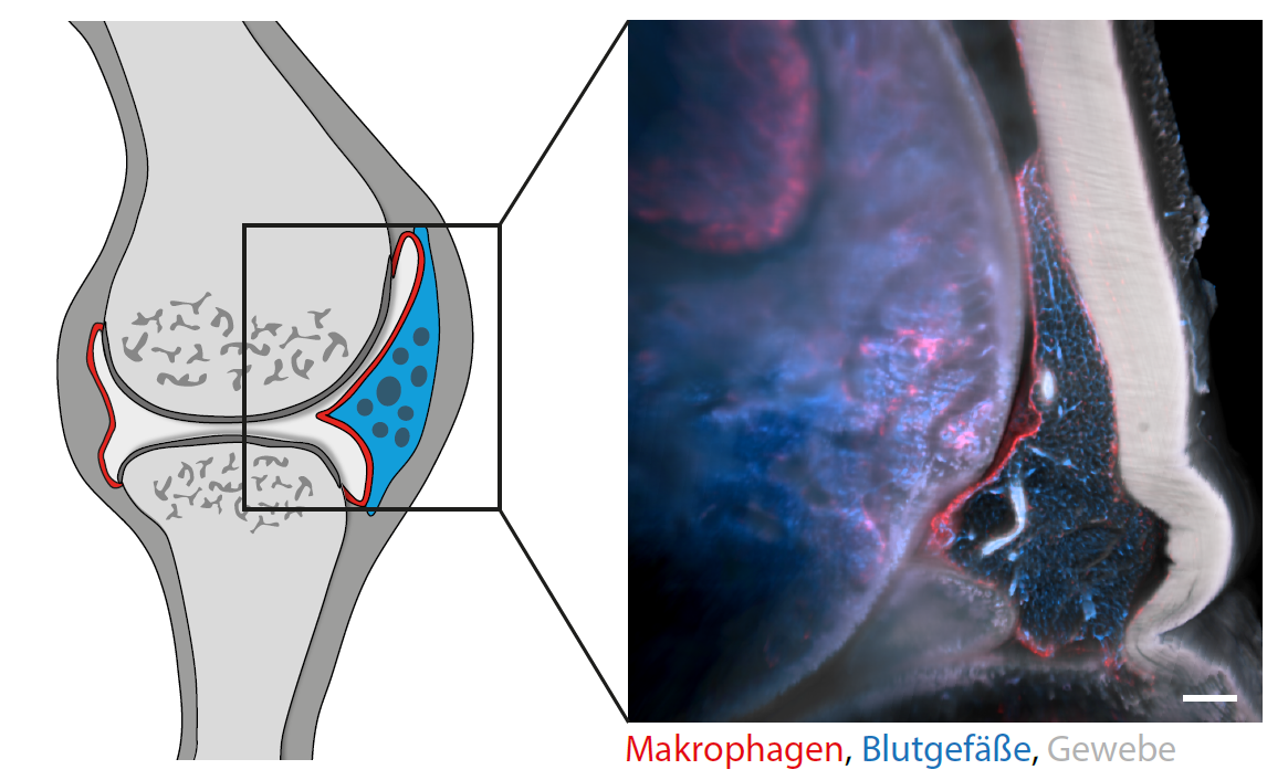 Die genauen Ursachen für chronisch-entzündliche Gelenkserkrankung wie die rheumatoide Arthritis sind noch nicht vollständig verstanden. Ein Team des Universitätsklinikums Erlangen und der Friedrich-Alexander-Universität Erlangen-Nürnberg (FAU) um Prof. Gerhard Krönke hat nun einen neuen Ansatz gewählt, um die zugrunde liegenden Mechanismen besser zu verstehen. Mit Hilfe einer eigens entwickelten Technik ist es Stephan Culemann und Dr. Anika Grüneboom aus der Medizinischen Klinik 3 – Rheumatologie und Immunologie – erstmals gelungen, entzündete Gelenke transparent und somit für Licht durchsichtig zu machen, um sie mittels dreidimensionaler molekularer Bildgebung zu untersuchen. Die hierdurch gewonnenen Einblicke in die komplexe Funktionsweise unseres Immunsystem wurden im Magazin „Nature“ veröffentlicht.