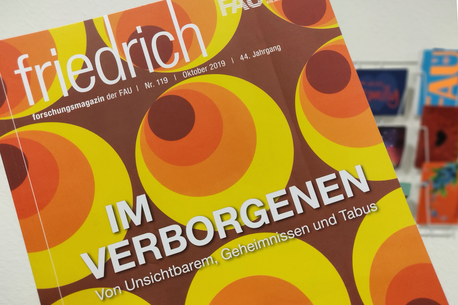 Die Ausgabe 2019 des Forschungsmagazins „friedrich“ nimmt die Leserinnen und Leser mit auf eine Entdeckungsreise „ins Verborgene“: Sie schaut auf Objekte, die für das bloße Auge unsichtbar sind oder die wir irgendwann aus den Augen verloren haben. Sie wirft aber auch einen Blick dorthin, wo wir gar nicht hinsehen wollen: auf Tabus. Anderes wiederum bemerken wir einfach gar nicht: Warum verhalten wir uns, wie wir uns verhalten? Beeinflusst uns Werbung tatsächlich unbemerkt? Und einiges wird absichtlich versteckt gehalten, Geheimnisse zum Beispiel. So sind viele Dinge ganz auf ihre Weise im Verborgenen.