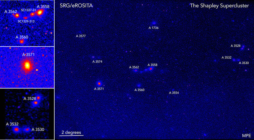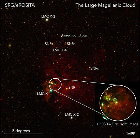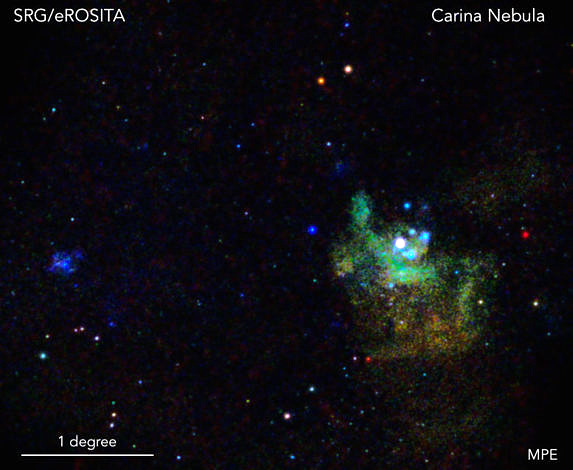 Die erste vollständige Himmelsdurchmusterung von eROSITA ist etwa viermal tiefer als die vorherige Karte des gesamten Röntgenhimmels durch das ROSAT-Teleskop vor 30 Jahren und liefert etwa zehnmal mehr Quellen: etwa so viele, wie von allen bisherigen Röntgenteleskopen zusammen entdeckt wurden. Und während die meisten Klassen astronomischer Objekte Röntgenstrahlen aussenden, sieht das heiße und energiereiche Universum ganz anders aus als durch optische oder Radioteleskope. Außerhalb unserer Heimatgalaxie sind die meisten eROSITA-Quellen aktive Kerne von Galaxien in kosmologischen Entfernungen, bei denen supermassereiche Schwarze Löcher Materie akkretieren. Daneben gibt es auch Galaxienhaufen, die als ausgedehnte Röntgenhalos erscheinen und dank des heißen Gases leuchten, das in den riesigen Ansammlungen aus dunkler Materie eingeschlossen ist. Das Bild des gesamten Himmels enthüllt aber auch die Struktur des heißen Gases in der Milchstraße selbst bis ins kleinste Detail sowie das zirkumgalaktische Medium, das sie umgibt und dessen Eigenschaften für das Verständnis der Entstehungsgeschichte unserer Galaxis von entscheidender Bedeutung sind. Die eROSITA-Röntgenkarte zeigt aber noch mehr: Sterne mit starken, magnetisch aktiven heißen Koronen, Röntgendoppelsterne, die Neutronensterne, Schwarze Löcher oder Weiße Zwerge enthalten, und spektakuläre Supernova-Überreste in unserer eigenen und anderen nahen Galaxien wie den beiden Magellanschen Wolken.