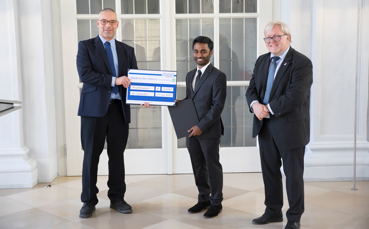 Urkundenübergabe an den Studenten des Jahres Sagithjan Surendra. Im Bild (von links): Uwe Scheer vom Studentenwerk Erlangen, Prof. Max-Emanuel Geis Vorsitzender des Landesverbands Bayern im Deutschen Hochschulverband, Sagithjan Surendra. (Bild:FAU/Erich Malter)