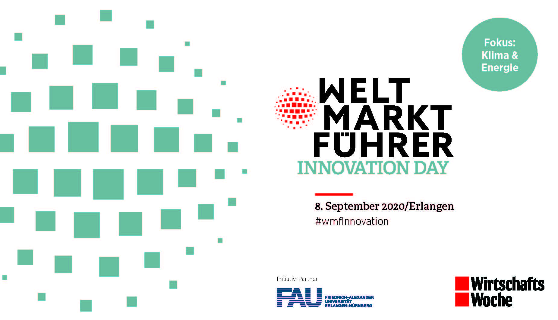 Die FAU ist Initiativ-Partner des „Weltmarktführer Innovation Day“ der WirtschaftsWoche, der am 8. September 2020 in Erlangen stattfindet. Renommierte Wissenschaftlerinnen und Wissenschaftler sowie Young Talents der FAU stellen ihre Forschungsergebnisse und Ideen zum Schwerpunktthema „Energie und Klima“ vor.