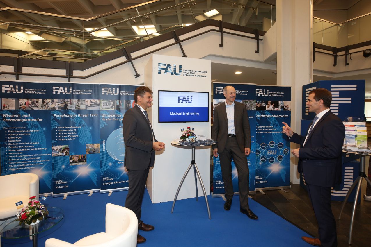 Am 8. September 2020 fand in Erlangen der erste „Weltmarktführer Innovation Day“ der Wirtschaftswoche in Kooperation mit der FAU statt. Renommierte Wissenschaftlerinnen und Wissenschaftler sowie Young Talents der FAU stellten ihre Forschungsergebnisse und Ideen zum Schwerpunktthema „Energie und Klima“ vor; rund 200 Teilnehmende aus Industrie und Wirtschaft tauschten sich zu Innovationen in diesem Themenbereich aus. Im Bild (von links): Prof. Dr. Joachim Hornegger,