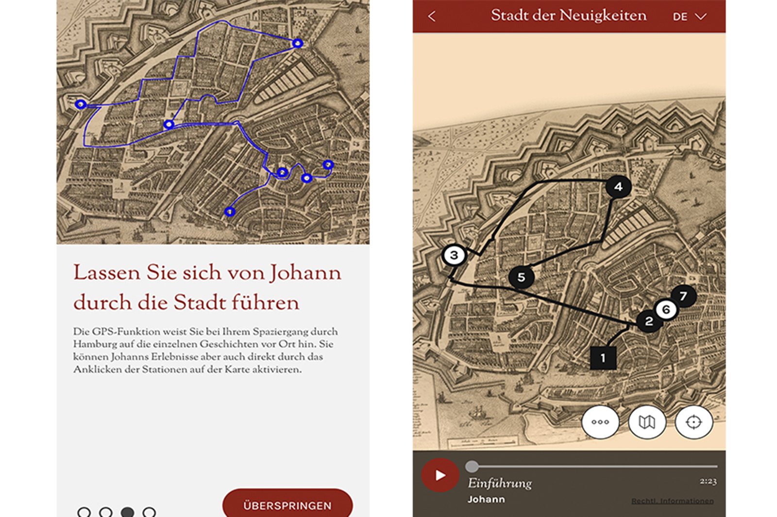 „Die Stadttour ist eigentlich ein Spaziergang durch Hamburg mit einer geolokalisierten historischen Karte des Jahres 1686 und einer aktuellen Stadtkarte. Unsere Tour führt in ein aufgewühltes Hamburg, in dem gerade erst zwei Hamburger Politiker öffentlich hingerichtet und Flugschriften verbrannt worden sind – und allerlei Gerüchte in den Kaffeehäusern und Gaststätten im Umlauf sind“, sagt Heise. „Unser Tourguide Johann ist auf der Jagd nach Flugschriften und Gerüchten und führt die App-Nutzer in Buchhandlungen und Kirchen, zu Zeitungsständen auf Marktplätzen, in ein Kaffeehaus und zum Opernhaus.“