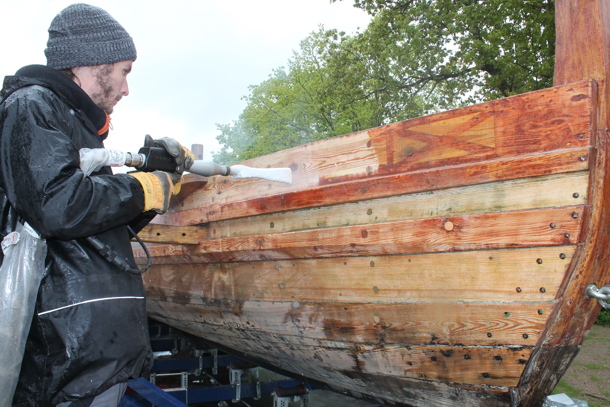 Um zu sehen, wie schlimm das Holz befallen ist, haben die Bootsbauerinnen und Bootsbauer die Farbe und den Lack der F.A.N. mit Trockeneis abgestrahlt. Die aufgemalten Augen am Bug schimmerten zuletzt nur noch leicht auf dem Holz. Die restliche grüne, blaue und rote Bemalung war verschwunden. Der freie Blick auf das Holz zeigte nichts Gutes. Überall am Schiff waren Planken befallen und zwar so stark, dass nur noch Austauschen möglich war. Ende Juli war dies auf der Backbordseite schon geschehen. Bis Anfang September tauschten die Bootsbauer gemeinsam mit den Studierenden und freiwilligen Helferinnen und Helfern auch die Steuerbordseite aus, schliffen die neuen Planken ab. Nun folgt das Kalfatern, also das Abdichten der Ritzen zwischen den Planken mit Hanfseilen. Dann kommt die F.A.N. wieder ins Wasser „Ein Holzboot gehört ins Wasser, an Land verzieht sich das Holz nur wieder“, sagt Prof. Dreyer.