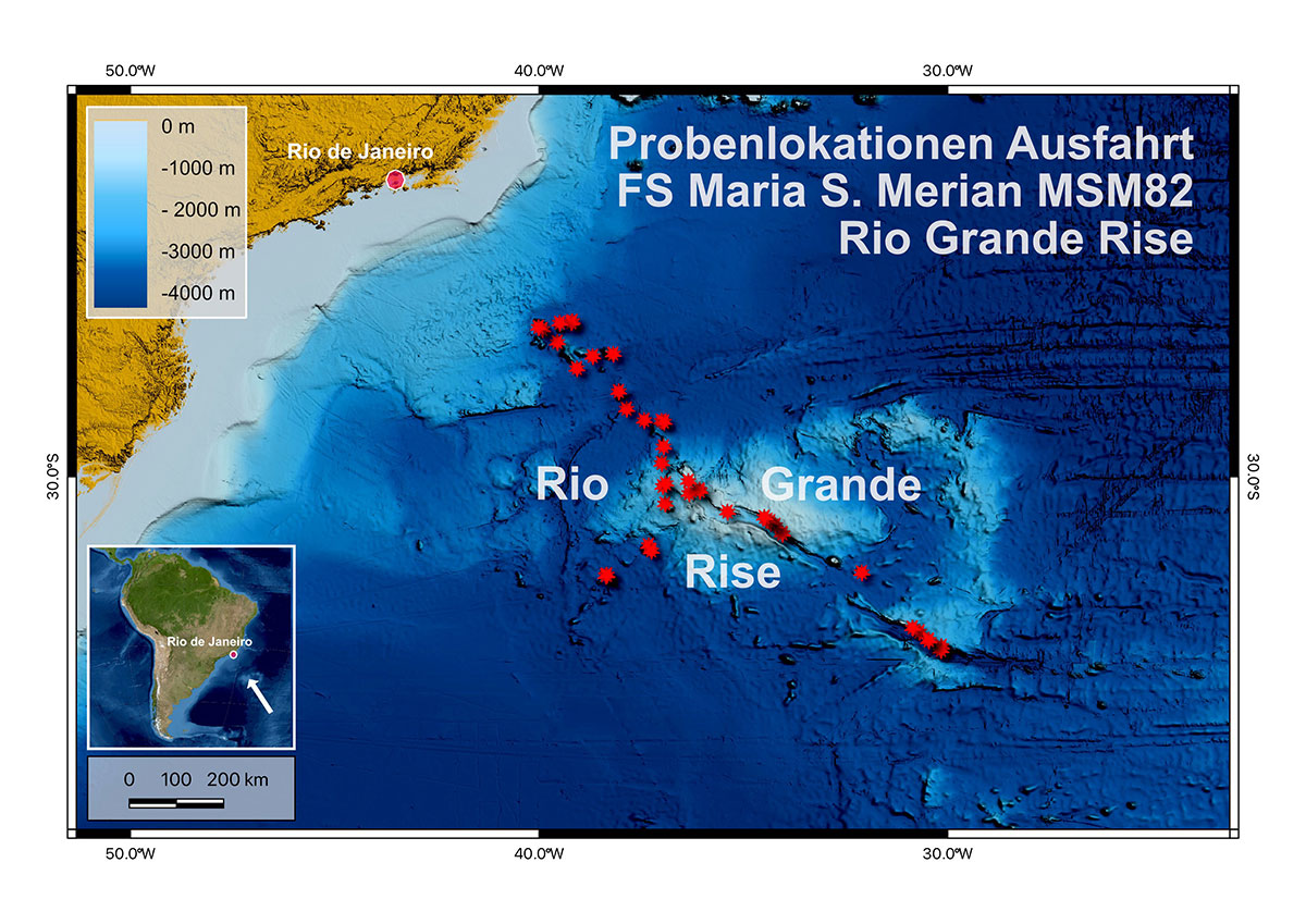 Auf Initiative des GeoZentrums Nordbayern startete im Frühjahr 2019 eine Expedition zum Rio Grande Rise. Gemeinsam mit Forschenden des Alfred-Wegener-Instituts Bremerhaven und des GEOMAR Helmholtz-Zentrum für Ozeanforschung Kiel haben fünf Wissenschaftlerinnen und Wissenschaftler der FAU an Bord des deutschen Forschungsschiffes „Maria S. Merian“ verschiedene Untersuchungen des submarinen Bergmassivs vorgenommen.