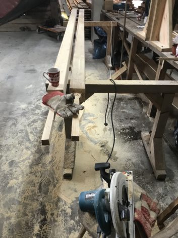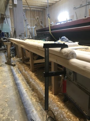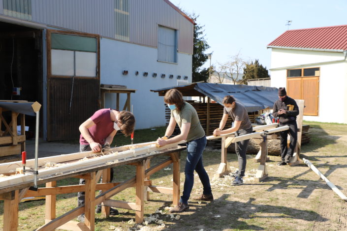 „Als Baumaterial für die Ruder war Fichte das Holz der Wahl“, berichtet Prof. Dreyer. Die 5 Meter langen Kanthölzer wurden dann von Dreyer und seinen Helfer/innen in zwei Versionen von 4,10 Meter und 4,70 Meter zurecht gesägt und gehobelt. Dabei wiederholten sich die Arbeitsschritte ständig: Anzeichnen, vorschneiden, dann erneut anzeichnen, damit aus dem Vierkant zunächst eine achtkantige Ruderschaft wird. Dann die eckigen Riemen rundhobeln und glattschleifen, am Ende ein Überzug mit Schutzlack. „Seit Ende 2020 sind so über 80 Riemen zusammengekommen“, sagt Prof. Boris Dreyer.