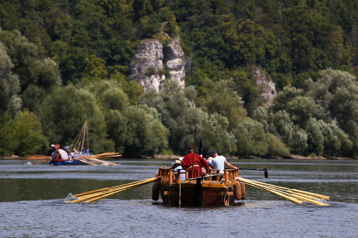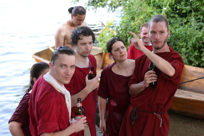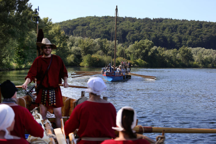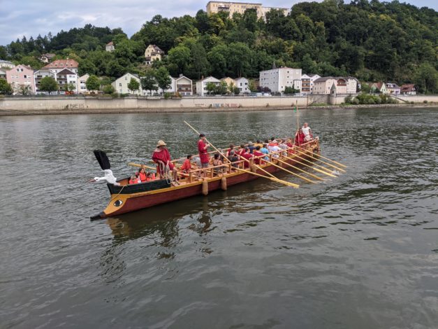‚Roma aeterna, Roma aeterna! Danuvina alacris!‘ Unter Jubelrufen legt das 18 Meter lange Holzboot von der Anlegestelle ab. Der schwarz, rot, gelb und grün bemalte Rumpf dreht sich in die Strömung und fährt hinaus auf den mächtigen Fluss an der Stelle, wo Inn und Ilz in die Donau fließen, das sogenannten Dreiflüsseeck. Mit an Bord sind Besucherinnen und Besucher des Festes hier in Passau; sie sitzen gemeinsam mit einigen aus der Stammbesatzung, die die letzten Tage das Boot die Donau hinab gerudert hat, an den Riemen, während Projektleiter Boris Dreyer am Steuer steht.