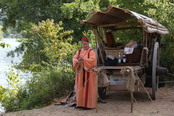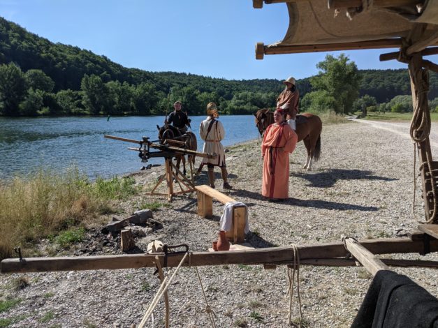 Was an eine Begegnung erinnert, wie sie sich vor 2000 Jahren hätte abspielen können, ist der Versorgungstrupp, der die Römerboote begleitet, verstärkt durch berittene Reenactoren mit einem pferdegezogenen Wagen. Diese grüßen den Verband in Kostümen immer wieder an geeigneten Stellen von Land aus. Das Geschütz ist eines der beiden antiken Feldgeschütze, die Studierende der FAU rekonstruiert und gebaut haben. Projektleiter Dreyer führt unterwegs aber auch Messungen an den Erlanger Booten durch: „So sollen unterschiedliche Strömungsverhalten und Schlagtaktungen erschlossen werden. Die Ergebnisse werten die Kollegen und Kolleginnen aus den Strömungswissenschaften und der Sportmedizin der FAU und der Hochschule Weihenstephan aus.“