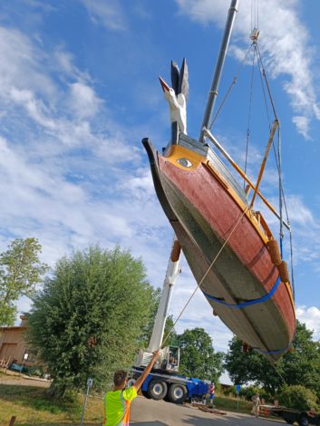 Samstag, der 16. Juli. Die Danuvina alacris und die F.A.N. werden mit Tieflader und Anhänger über Land nach Kelheim gebracht, wo eine Spezialfirma sie im Gewerbehafen per Kran zu Wasser lässt. Nun stoßen auch die Besatzungen, die zuvor schon in Ingolstadt dabei waren, wieder hinzu. Am Sonntag werden sie die beiden Boote an die Anlegestelle Altmühltal in Kelheim rudern.