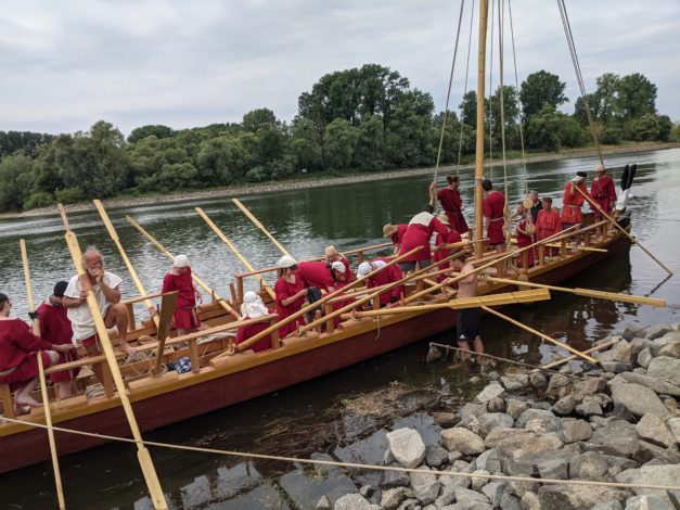 Der 23. Juli ist der letzte Tag, an dem die Männer und Frauen für längere Zeit auf den Ruderbänken der Danuvina alacris Platz nehmen, bevor sie an eine Besatzung aus Österreich übergeben wird. Das Römerboot fährt dann weiter die Donau hinab bis Galati in Rumänien. Bis Budapest übernimmt das Team aus Österreich, dann übernehmen Teams aus den jeweiligen Ländern, durch die die Danuvina alacris noch fährt. In den letzten sieben Tagen haben Boris Dreyer und seine Mannschaft den Nachbau eines römischen Patrouillenbootes auf deutscher Seite erfolgreich durch allerlei Untiefen gesteuert und gestern erst sind sie, nach einer Woche Fahrt, in Passau eingelaufen. Gestartet waren sie in Kelheim, obwohl dies so nicht geplant war.