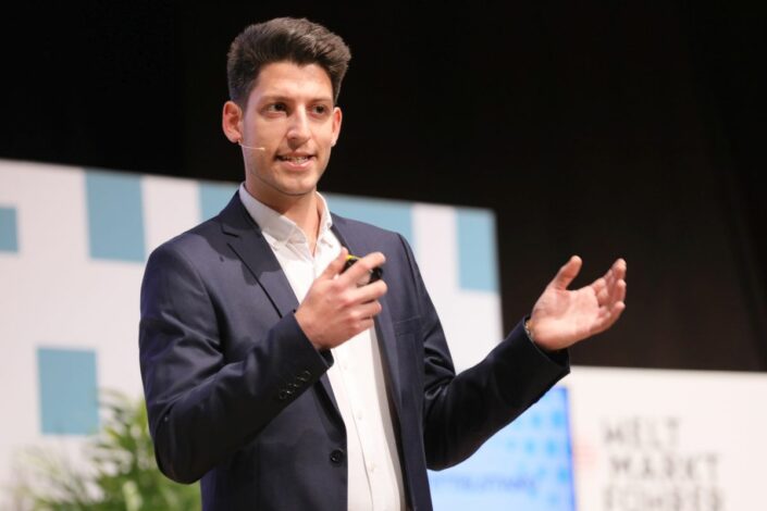 Bereits zum vierten Mal findet der von der WirtschaftsWoche initiierte 'Weltmarktführer Innovation Day' in Kooperation mit der Friedrich-Alexander-Universität Erlangen-Nürnberg in Erlangen statt. In diesem Jahr werden kreative Lösungen und innovative Ansätze aus Wirtschaft, Industrie und Forschung zu den Themen 'Klima' und 'Energie' diskutiert. Im Bild: FAU-Alumnus Matthias Trost, Co-Founder des Start-ups Amperial. (Bild: FAU/Kurt Fuchs)