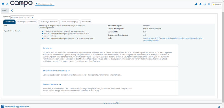 Auch die Anmeldung zu den Kursen hat sich verändert. Diese läuft ab sofort nur noch über StudOn. Campo selbst verfügt über keine Anmeldefunktion.