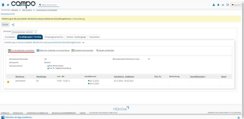 - Durch einen Klick auf die Veranstaltung sind genauere Informationen, wie beispielsweise Uhrzeit oder Inhalt einsehbar. Unter dem Reiter Parallelgruppen/Termine findet sich der Button „Für Stundenplan vormerken“. Nach dem Klick auf den Button erscheint der Kurs im Stundenplan.