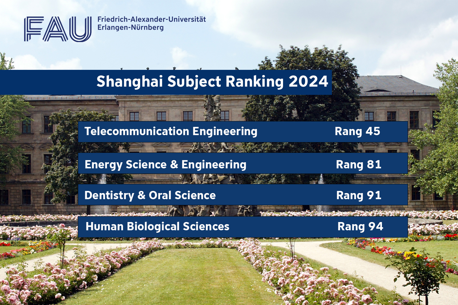 In vier Fächern gehört die FAU zu den 100 besten Universitäten weltweit. In Deutschland schafft die FAU sogar in siebzehn Fächern den Sprung in die Top 10. Insgesamt flossen in das Ranking Daten von mehr als 5000 Universitäten weltweit ein.