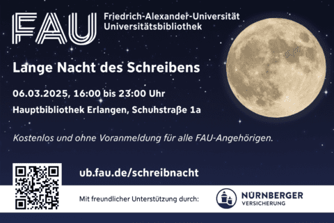 Zur Webseite „Lange Nacht des Schreibens in der Hauptbibliothek“Veranstaltet wird die „Lange Nacht des Schreibens“ von der UB in Zusammenarbeit mit dem Schreibzentrum am Sprachenzentrum (SZ), dem Career Service, dem Regionalen Rechenzentrum Erlangen (RRZE), der Fachschaftsvertretung der Philosophischen Fakultät und Fachbereich Theologie (FSV Phil) sowie der Studierendenvertretung (Stuve).