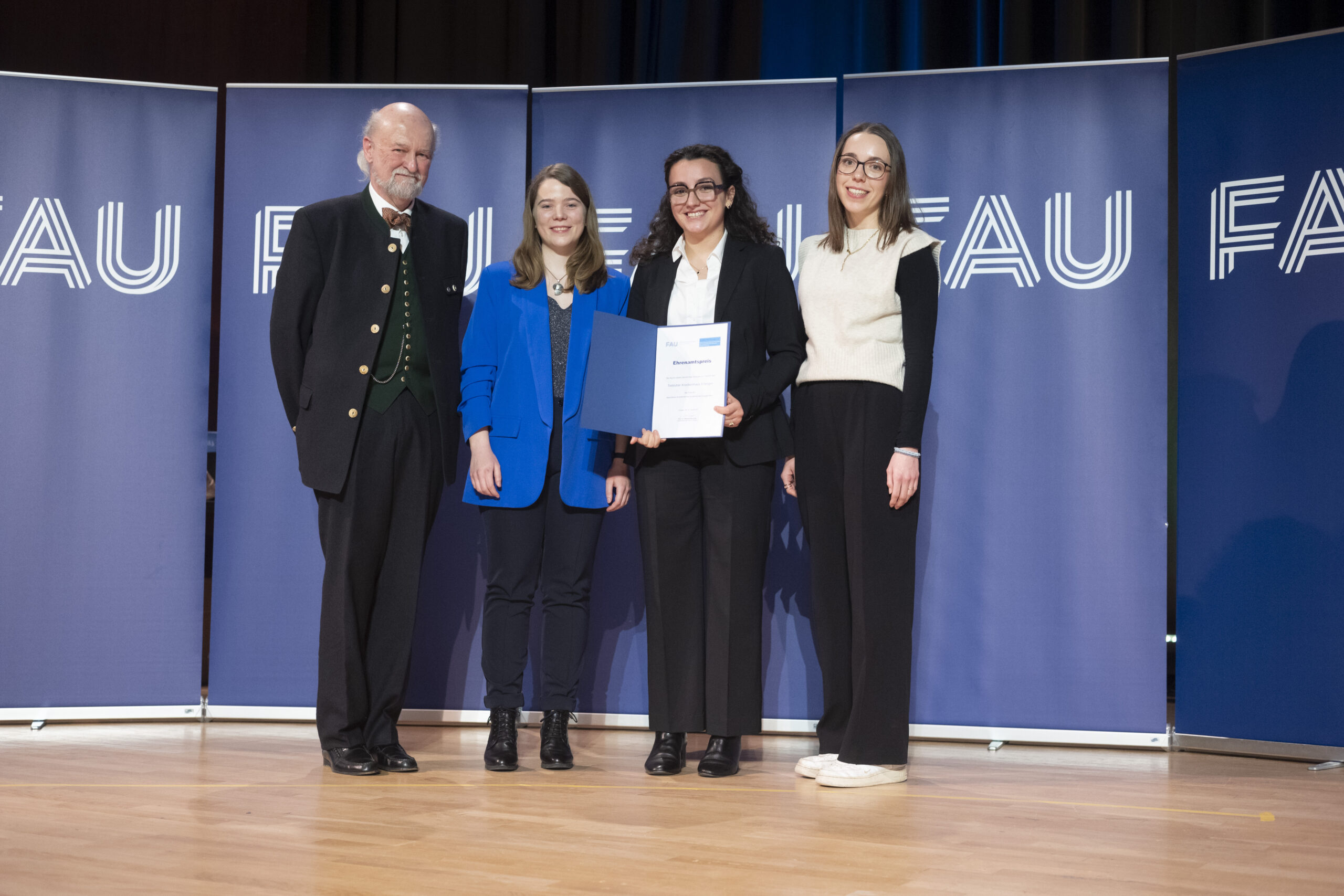 Um dieses ehrenamtliche Engagement zu würdigen, hat der Alumni-Verein der Medizinischen Fakultät an der Examensfeier des Studiengangs Humanmedizin nun einen Ehrenamtspreis an das Teddybärenkrankenhaus Erlangen verliehen. Die Organisatorin des Teddybärenkrankenhaus und Studentin der Humanmedizin im 8. Semester, Pelagija Zlatic, und ihre beiden Kommilitoninnen Amelie Schünemann und Sandra Gicklhorn haben den Preis von Prof. Dr. Winfried Neuhuber aus dem Vorstand des Alumnivereins entgegengenommen.