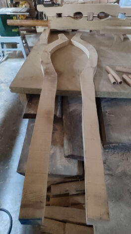 Besonders herausfordernd: Die Räder des Streitwagens wurden nicht aus einzelnen Segmenten gefertigt, sondern aus einem einzigen Stück Holz gebogen. Um zu verhindern, dass das Holz bricht, während es gebogen wird, wurde eine etwa drei Meter lange Eschenbohle in kochendem Wasser über 12 Stunden lang erhitzt und dann unter Spannung gebogen. So konnte das Team der Professur für Alte Geschichte die Eschen so um 360° zu zwei Rädern mit 86 cm Durchmesser biegen. Auch Teil des Wagens ist eine sogenannte Längsfederung. Die Kelten nutzten diese, um sowohl die Pferde als auch die Lenker durch die Dämpfung der Stöße zu schonen.
