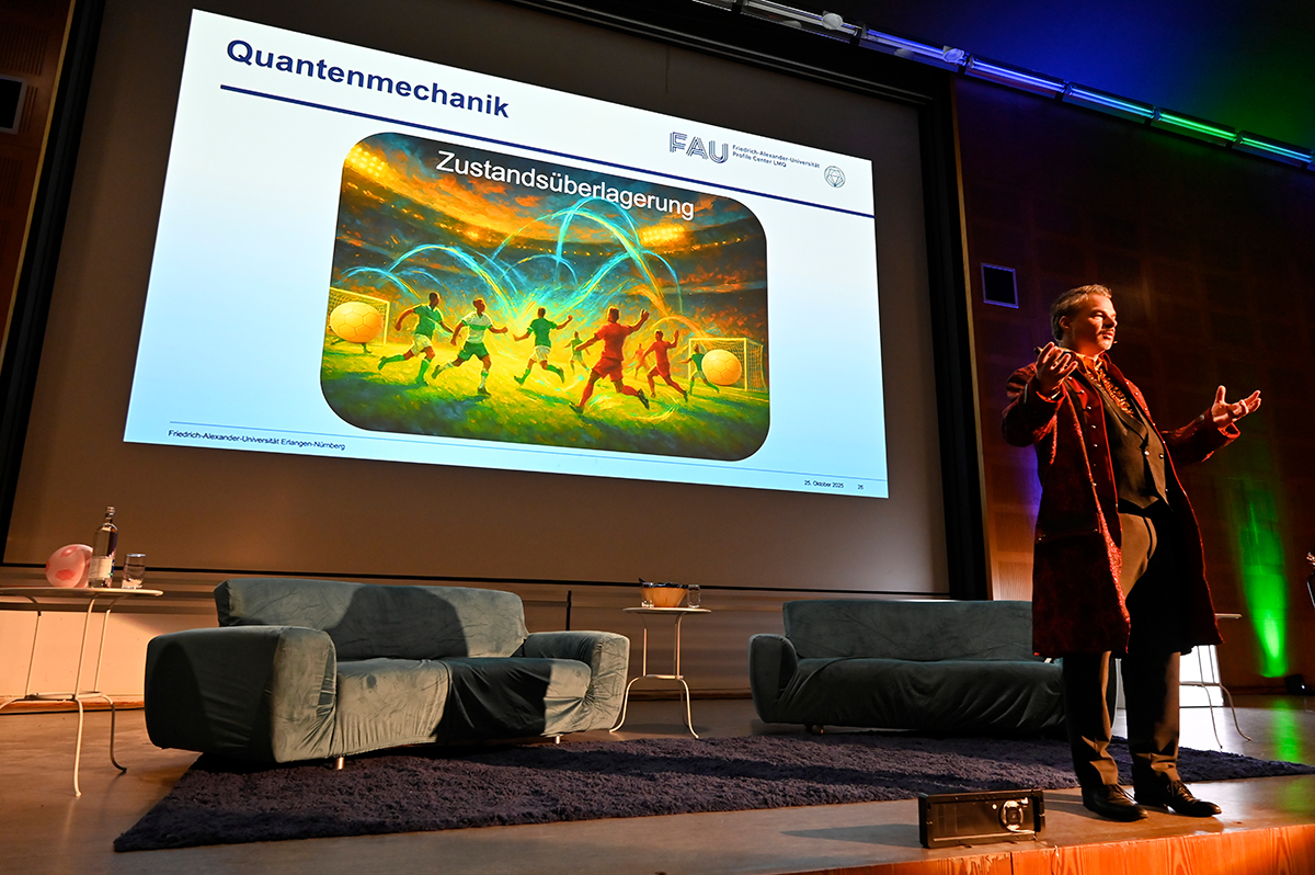 Kaum ein Forschungsfeld ist so faszinierend und zugleich so herausfordernd wie die Quantenwelt. Vor genau hundert Jahren hat Werner Heisenberg auf Helgoland mit der ersten konsistenten Formulierung der Quantenmechanik den großen Durchbruch erzielt – und genau deshalb stand sie im Mittelpunkt des Internationalen Jahres der Quantenwissenschaften und Quantentechnologien 2025. Anlass genug für die FAU, diesem Thema einen ganzen Abend im Audimax zu widmen – mit inspirierenden Talkrunden, spannenden Programmpunkten von der Geburtsstunde der Quanten und Quantentechnologien, spielerische Quanten-Games bis zum – wortwörtlichen – Schlusslicht des Abends: ein Impuls-Vortrag über Quanten-Licht.