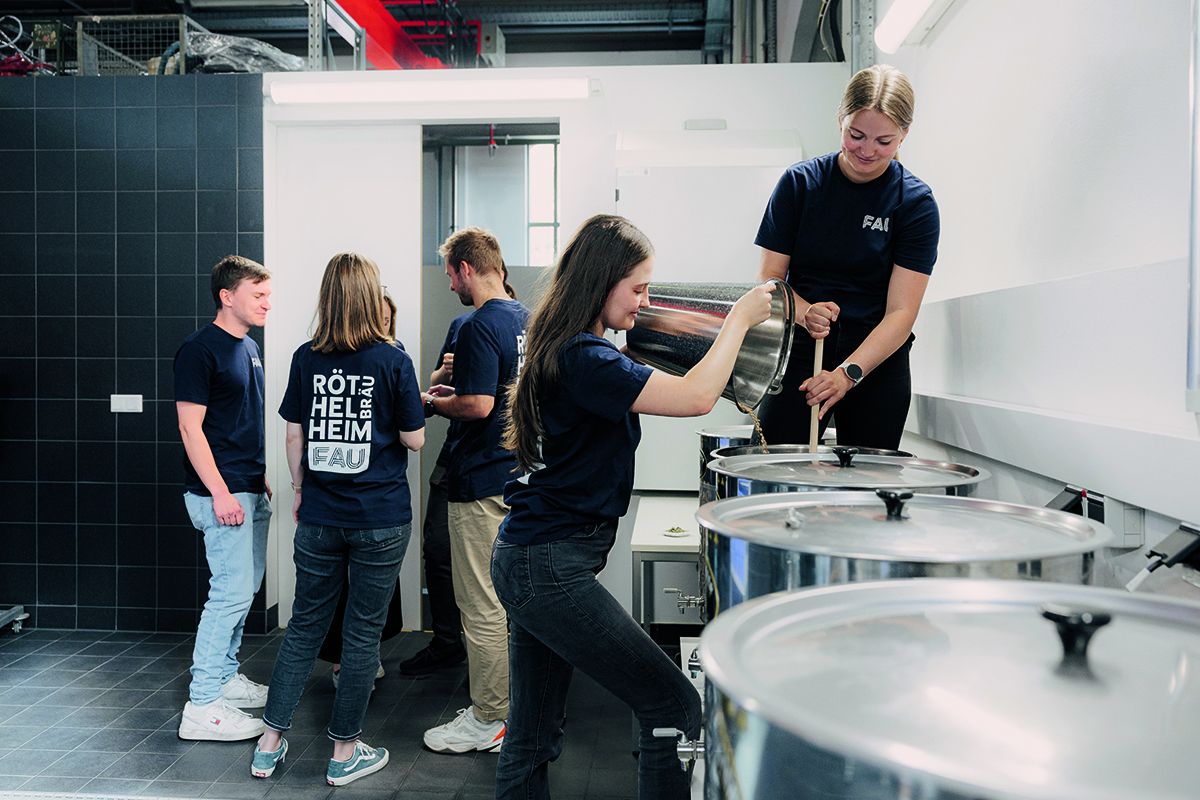Zurück zum Bier: Rund 200 Liter werden bei jedem Brauvorgang hergestellt. Seit 2024 besitzt der Lehrstuhl die Lizenz, die RöthelheimSpezialitäten auch für Bierfans abzufüllen, die nicht am Brauprozess beteiligt sind. „Die wenigen Flaschen und 20LiterFässer sind immer schnell vergriffen“, sagt Kathrin Castiglione. Größere Chancen auf eine Kostprobe bieten Events, auf denen die BrauAG ihre Kreationen vorstellt, etwa die Sommerfeste der Departments, Weihnachts und Promotionsfeiern oder die Lange Nacht der Wissenschaften. Und wer es etwas kräftiger mag, kann zum jährlichen MartiniTreffen auf den Erlanger Berg gehen: Wenn dort die Starkbierzeit eingeläutet wird, ist auch die FAU mit einem Fass vertreten.