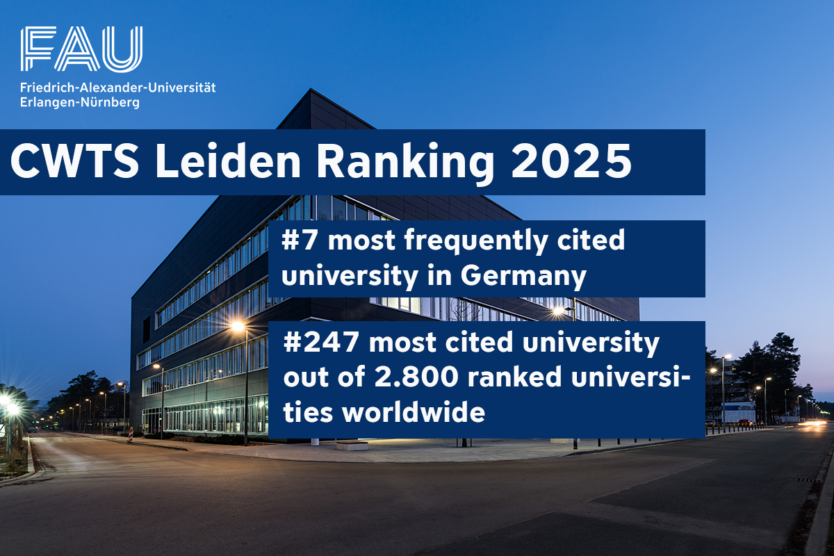 Deutschlandweit befindet sich die FAU gemessen nach den meistzitiertesten Veröffentlichungen auf Platz 7 und behauptet sich damit – seit der erstmaligen Veröffentlichung des Leiden-Rankings 2007 – jedes Jahr in den Top Ten. International belegt die FAU Platz 247, womit sie sich wie im Vorjahr unter den 250 besten Universitäten weltweit befindet.